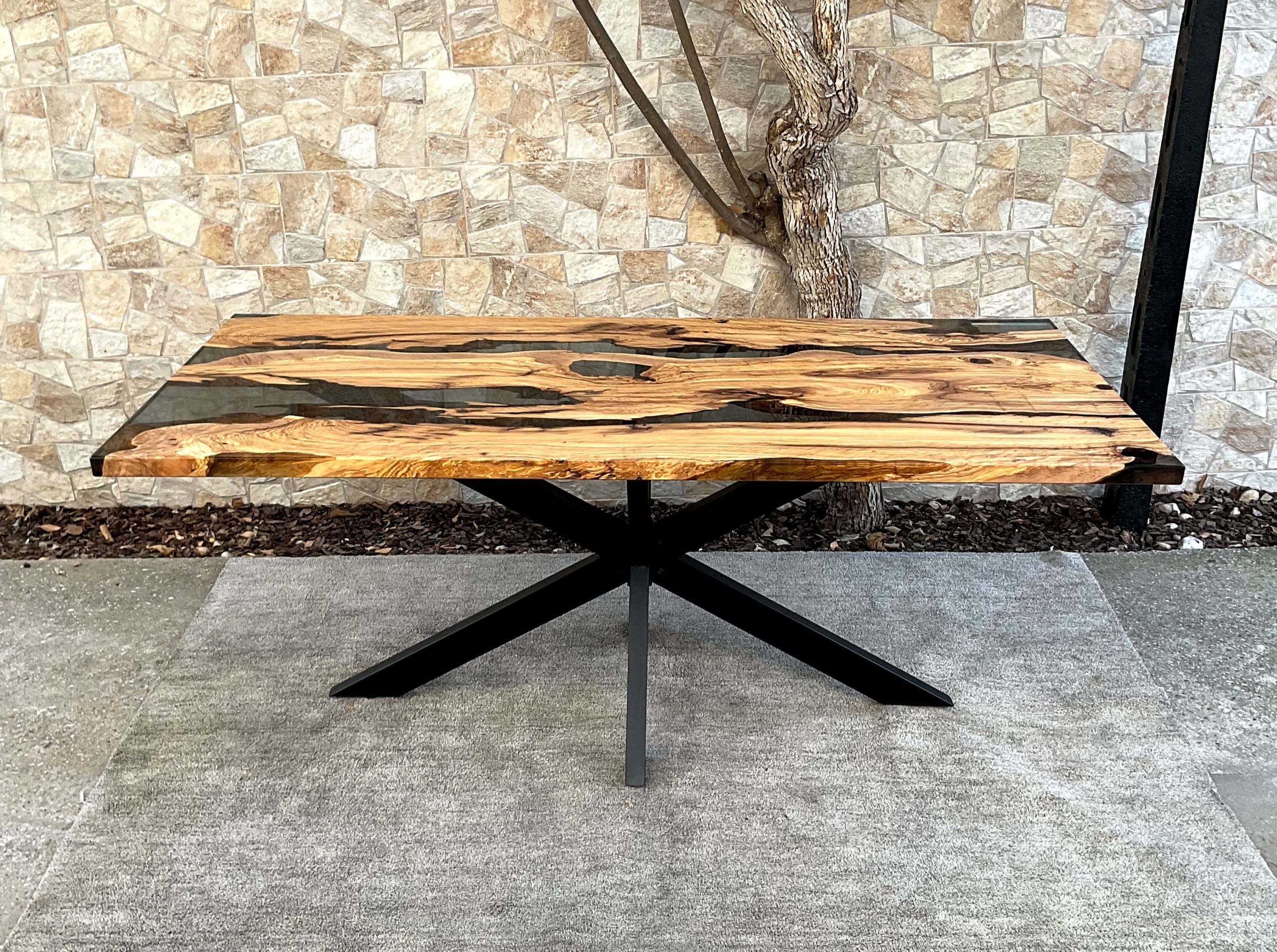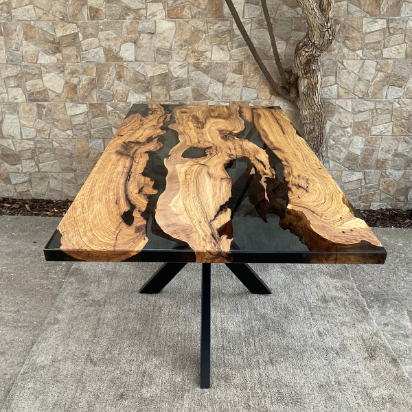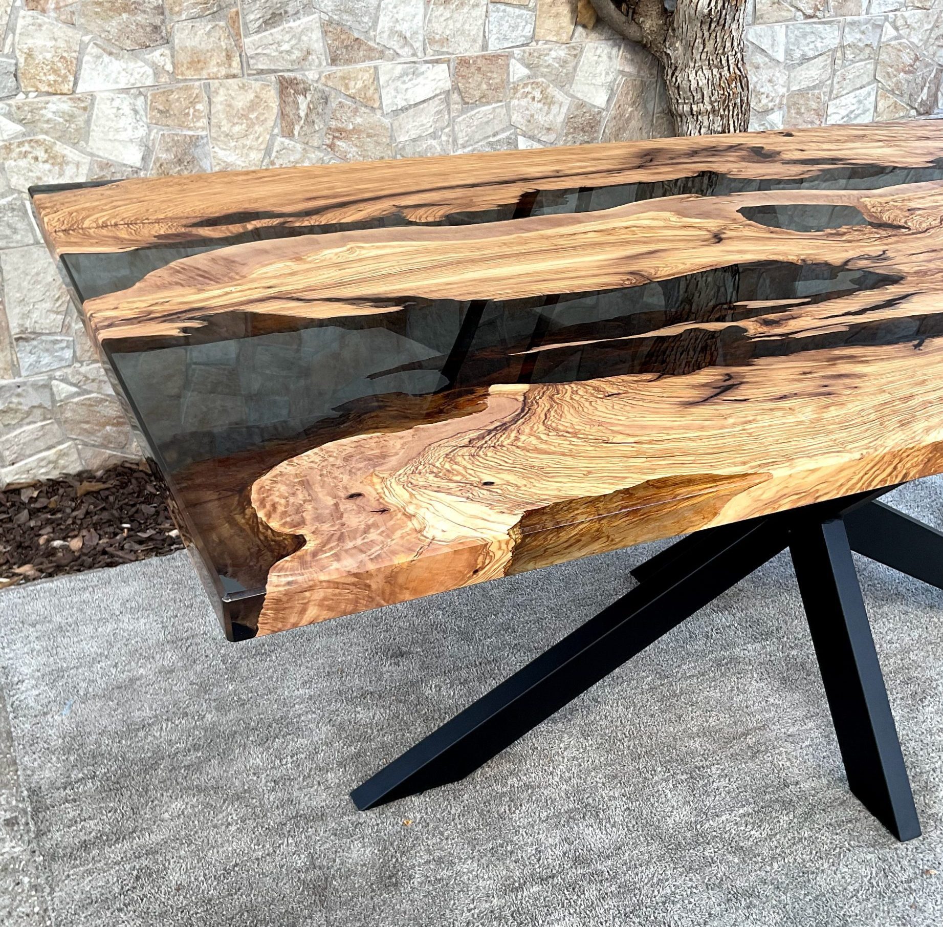 Legno di ulivo secolare e resina Fumè con gamba a stella in metallo.