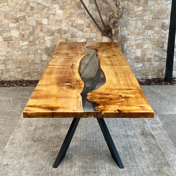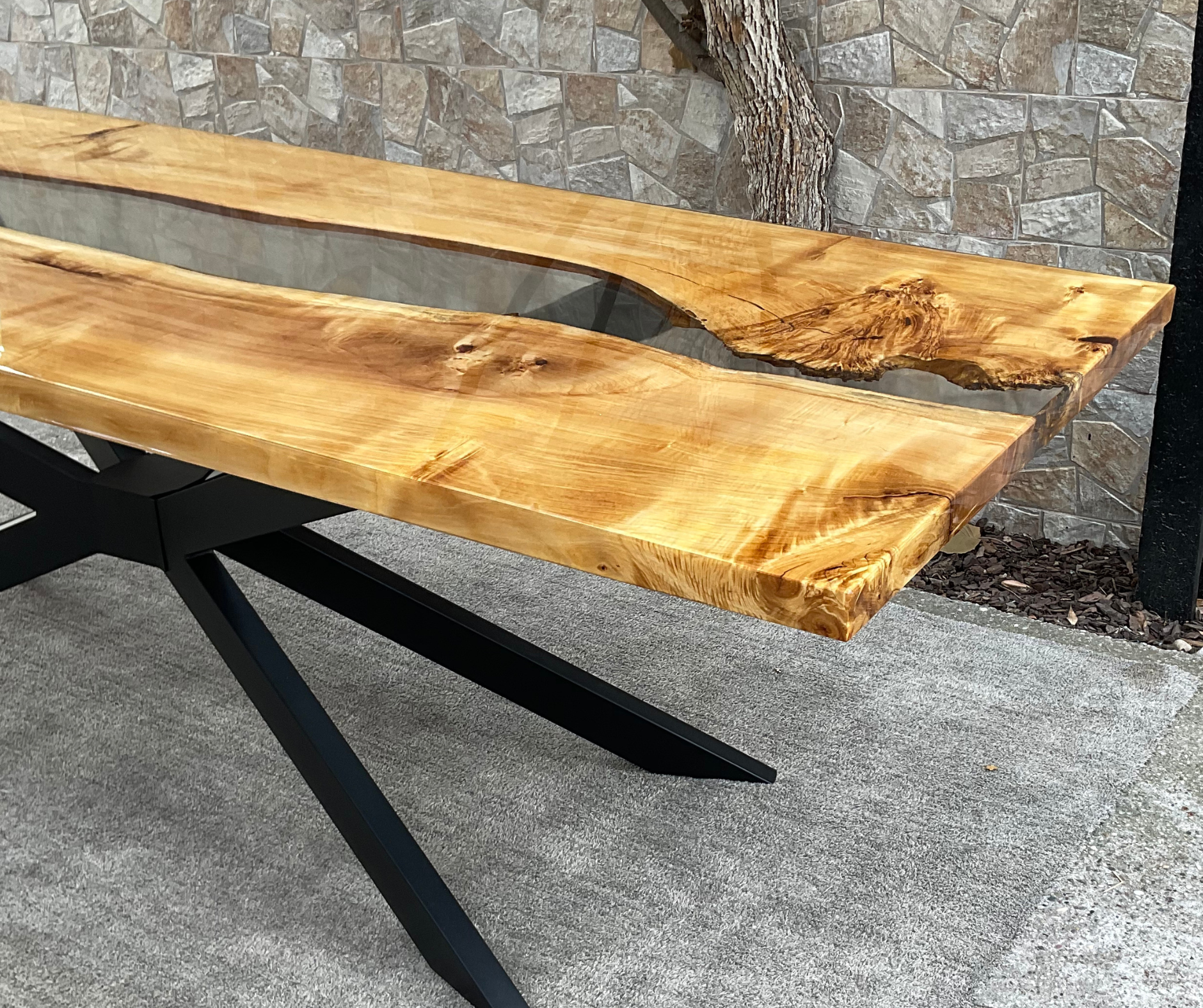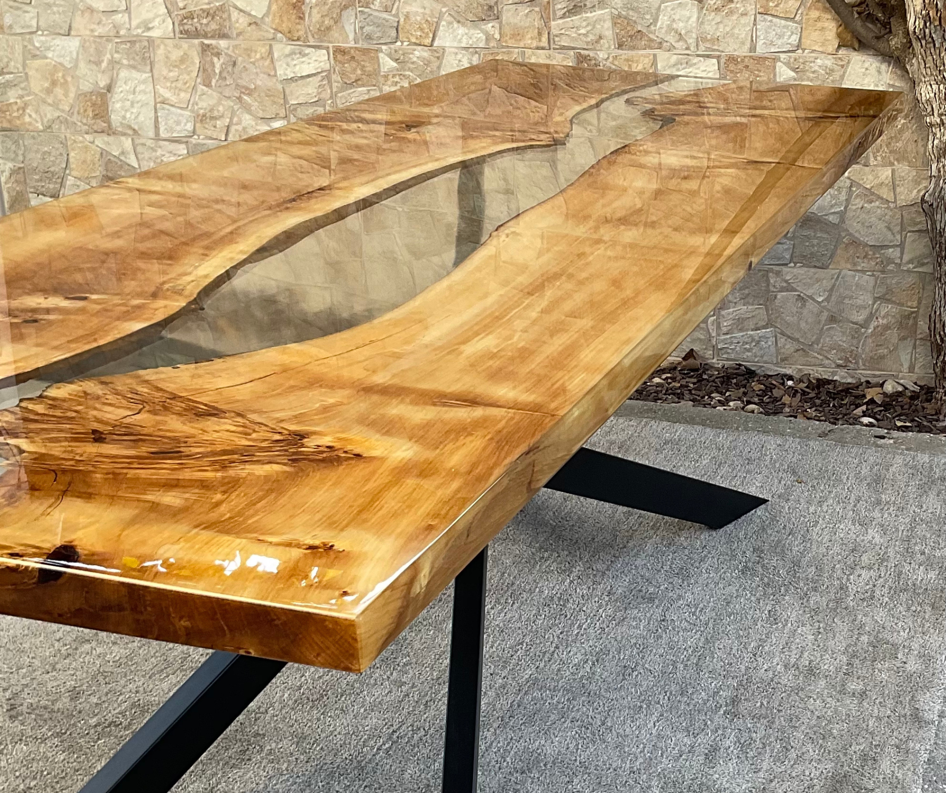 Tavolo artigianale in legno massello e resina epossidica di colore trasparente effetto cristallo.  Un pezzo unico e di alta qualità, realizzato a mano dai nostri abili artigiani. Il piano del tavolo è costituito un legno massiccio attentamente analizzato e selezionato.