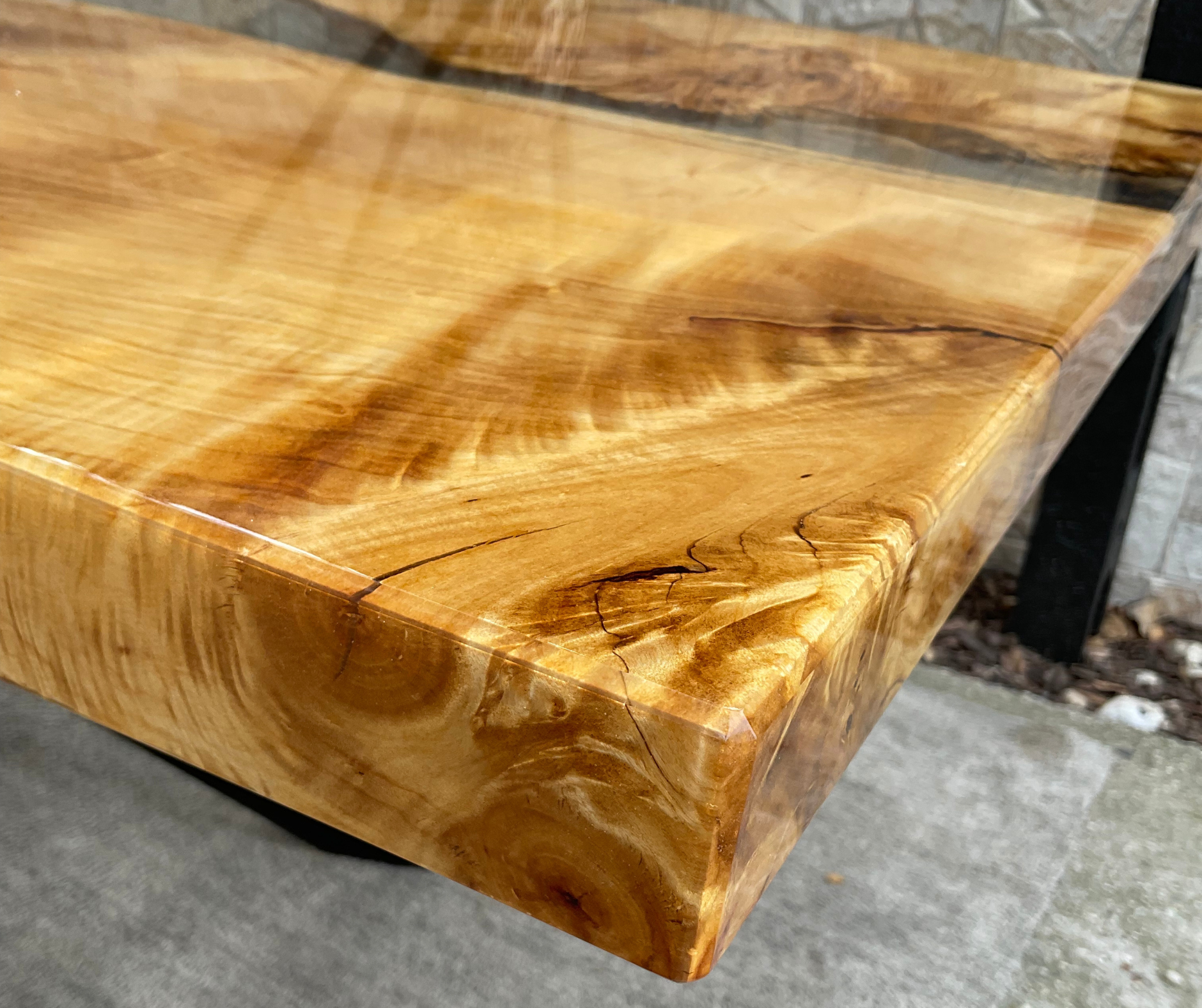In combinazione al legno massello è stata applicata della resina epossidica per creare un effetto visivo e tattile sorprendente, che mette in risalto la naturale bellezza del legno e crea un contrasto tra il legno liscio e la resina lucida.